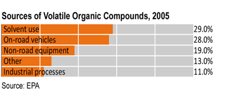 It was reported that road vehicles as the second-largest source of volatile organic compounds in the U.S. at 28%.