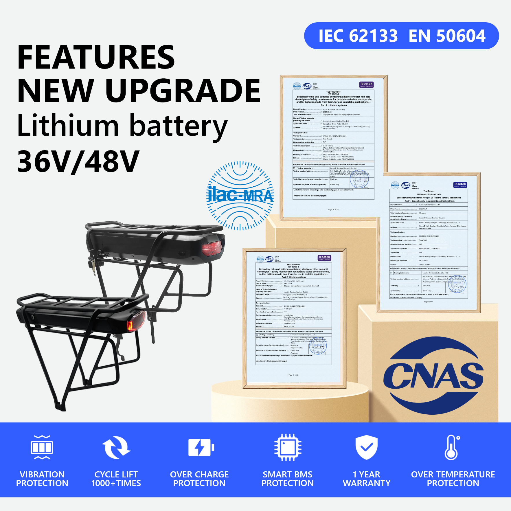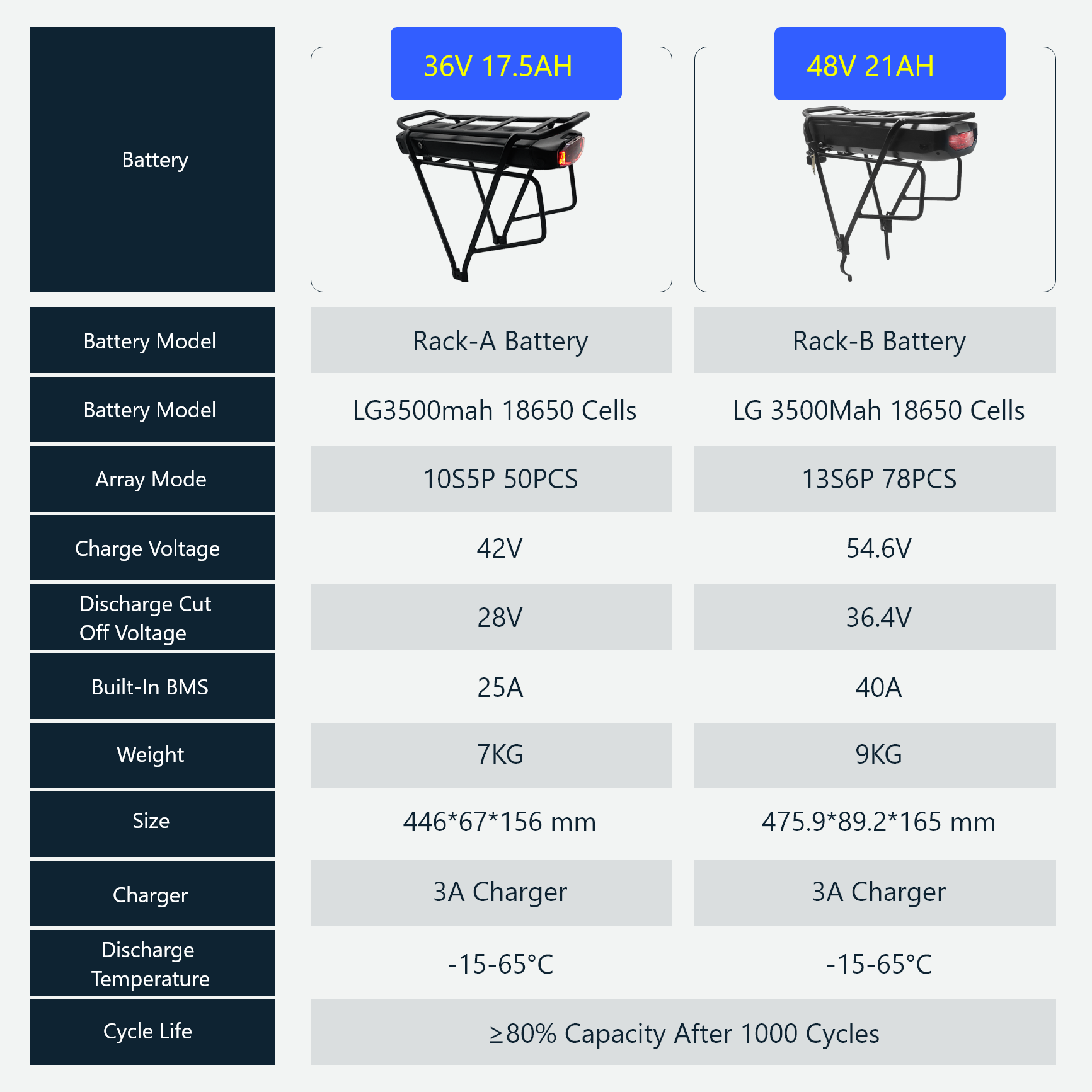 Our 36V e bike battery features a combination of LG/Chinese Ternary lithium cells. Its high-quality positive electrode ensures robust cycle performance and reliability. On a single charge, this 36V battery for electric bike powers up to 60 kilometers in pure electric mode and extends over 90 kilometers with pedal assist. After 1000 charge cycles, it still retains 80% of its capacity. It also includes a powerful 48V e-bike battery option, catering to different riding needs and preferences.