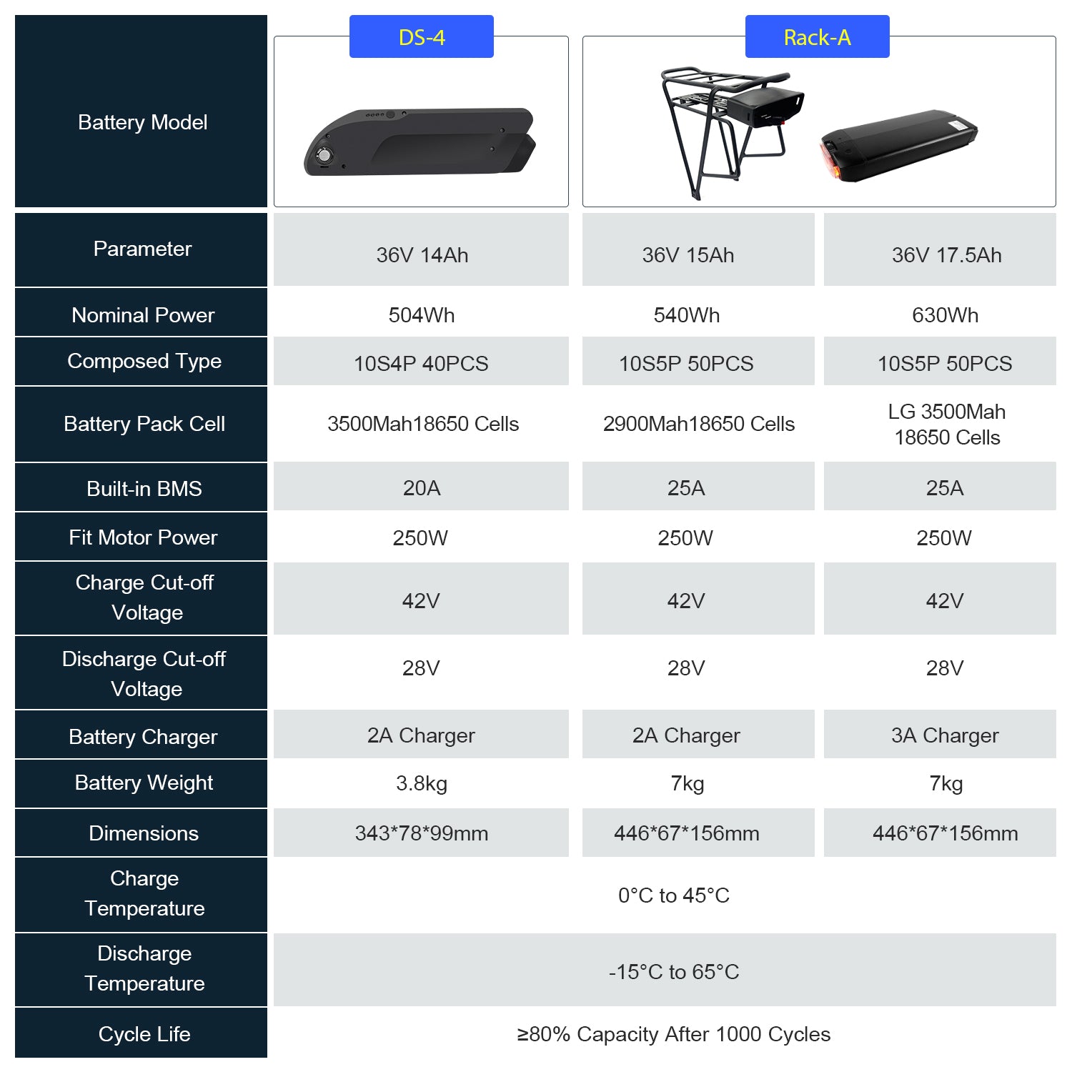 • Reliable Battery Performance: Choose between the 36V 13AH DP-5C Battery or the 36V 15AH DP-5C Battery. Both offer efficient performance, with a charge time of 5 hours and a discharge cut-off voltage of 28V.