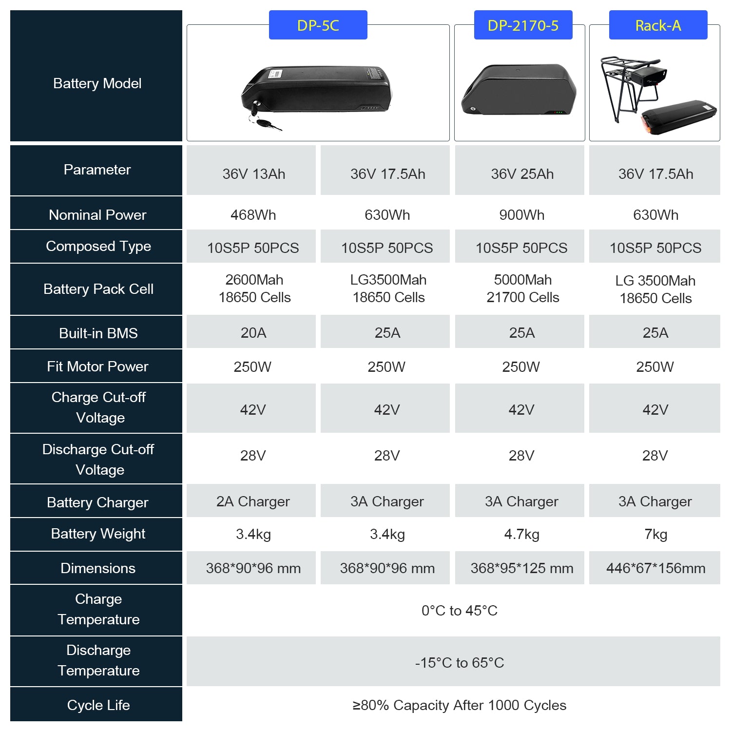 - Reliable Battery Performance: Choose between the 36V 13AH DP-5C Battery or the 36V 15AH DP-5C Battery. Both offer efficient performance, with a charge time of 5 hours and a discharge cut-off voltage of 28V.