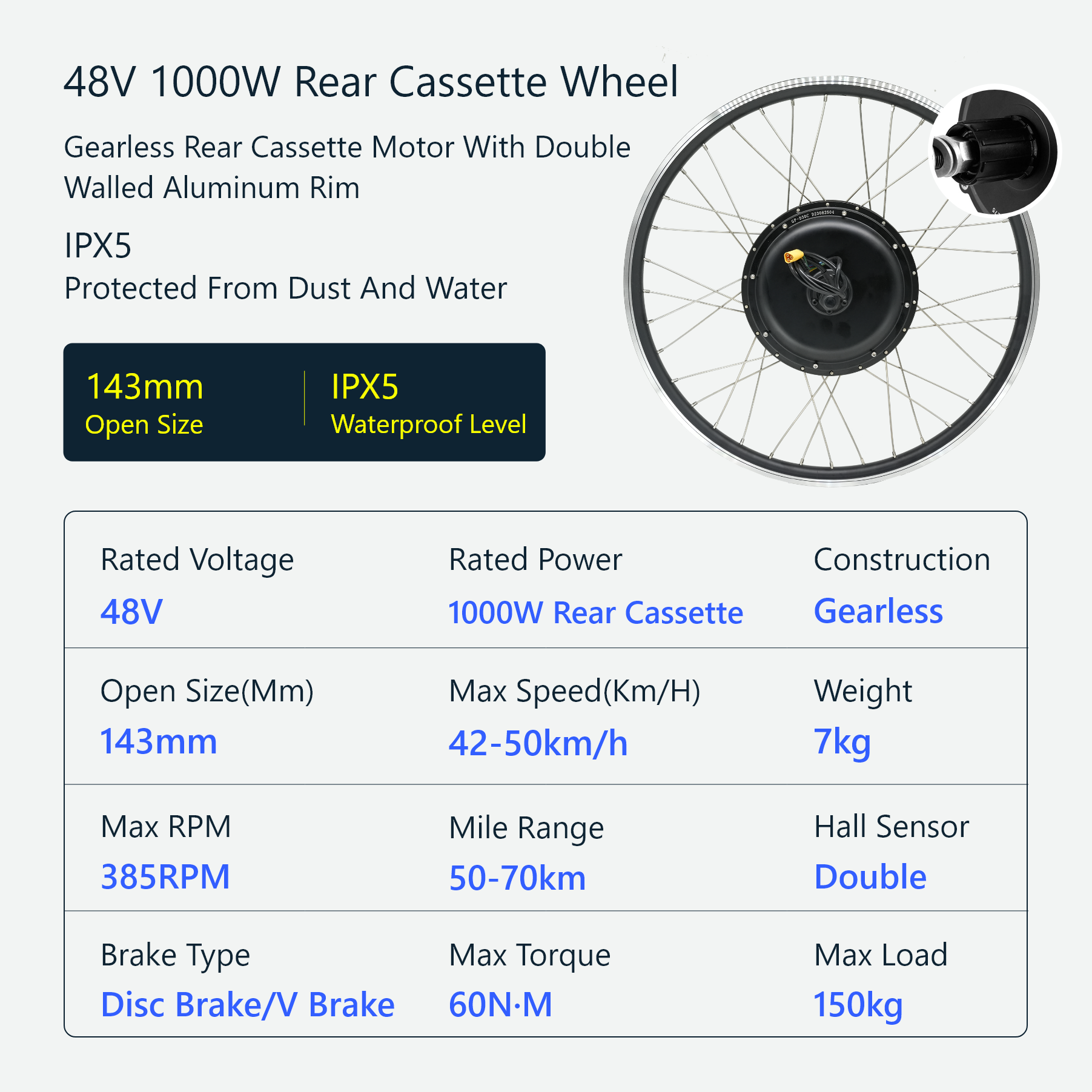 The 1000W rear cassette hub motor electric bike conversion kit with a 48V lithium battery delivers exceptional value and unparalleled versatility. Transform your cherished bike into a robust eBike equipped to reach speeds of up to 45 km/h and a range of 50-70 km on a single charge. This 1000w ebike conversion kit is designed specifically for the rear cassette, supports a maximum load of 150 kg and recharges fully in just 6 hours.